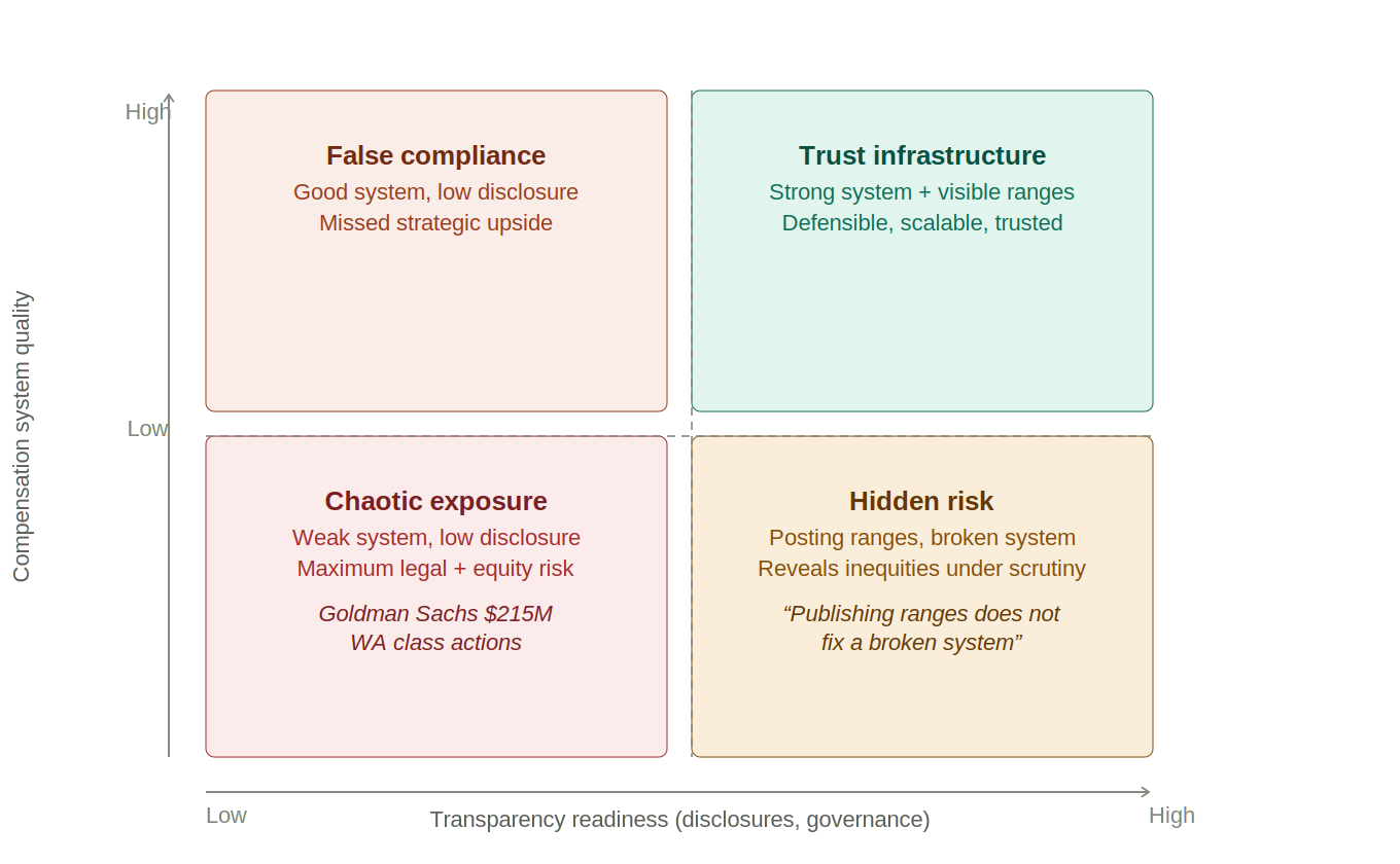 Increased enforcement changes the cost-benefit calculus for leadership teams. Transparency is no longer simply about signaling values or improving candidate experience; it is increasingly about reducing legal exposure and managing downside risk. In this sense, fear and compliance are not cynical motivators, they are rational governance responses to a regulatory environment in which pay practices are becoming more visible, more contestable, and more legally actionable. This reality further reinforces the central thesis of this article: organizations that attempt to "bolt on" transparency without modernizing their compensation operating model and data infrastructure are not merely inefficient, they are assuming avoidable legal and reputational risk.