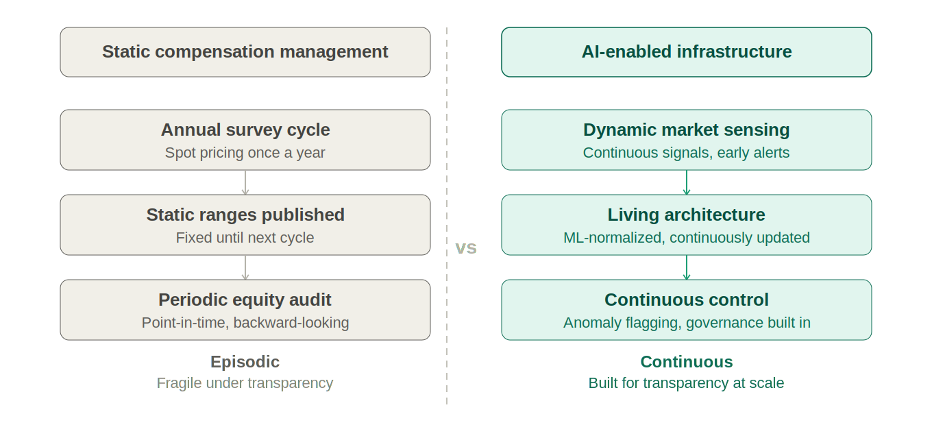 Historically, compensation infrastructure has been largely static. Job architectures are refreshed episodically, market pricing is updated annually or semi-annually, and equity analyses are performed at discrete points in time. This cadence made sense when compensation information traveled slowly and transparency expectations were limited. In transparent environments, however, these lagging systems become a structural liability. Employees see ranges in near real-time. Candidates compare offers instantaneously. Market dynamics shift faster than annual survey cycles can capture.
